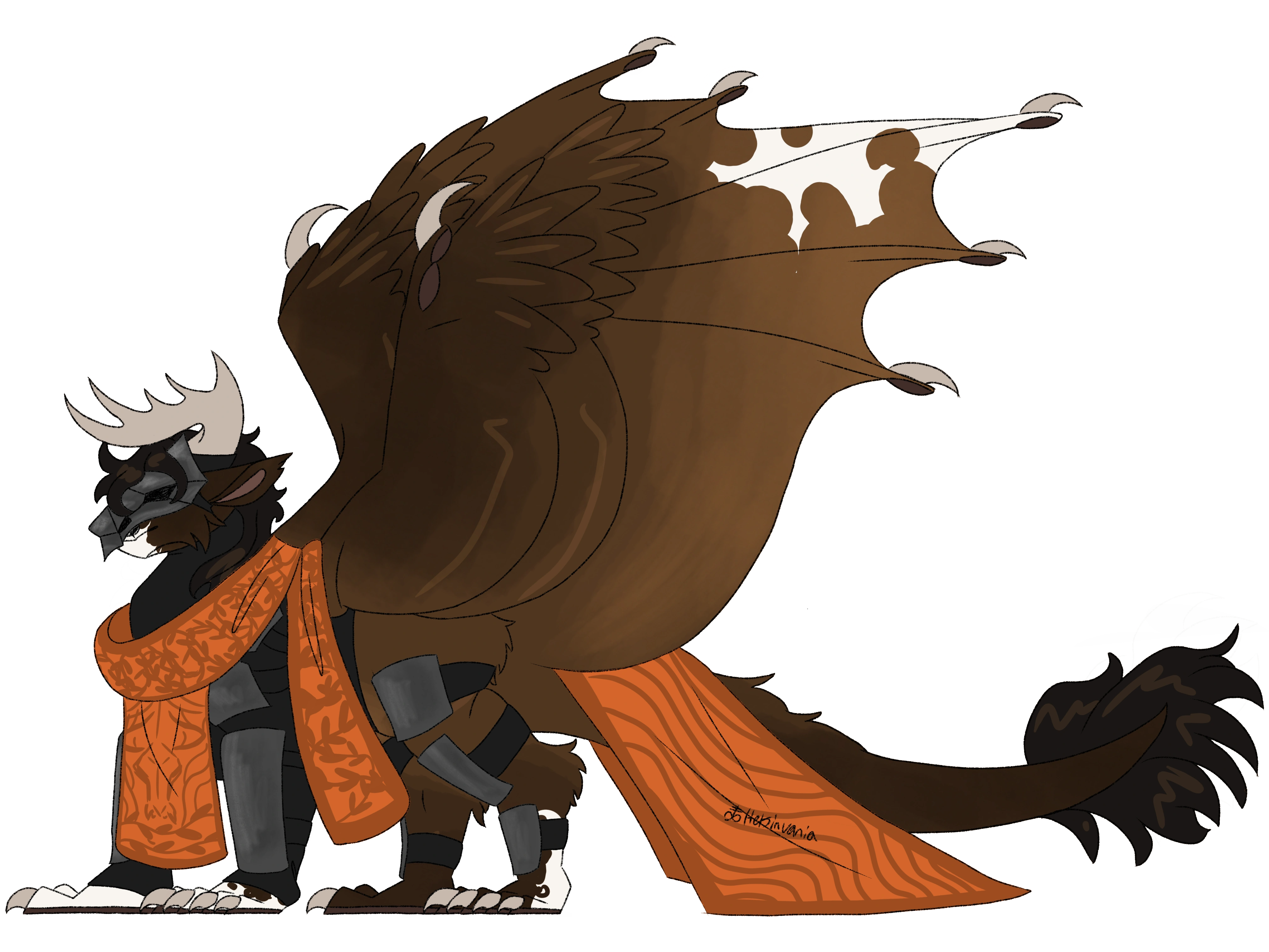 MortarWings are a solid and sturdy tribe descended from both SkyWings and MudWings. They're hardy and strong, with long, firm legs, strong, arched snouts and thick necks, chests, and tails. Their wings are nothing special, scaling with their body weight. A pair of horns branch out from their heads into several ends much like the antlers of elk or caribou, but are generally known to be much more varied and diverse than the other tribes. Their claws are long and flat for scavenging through the dirt and forest.