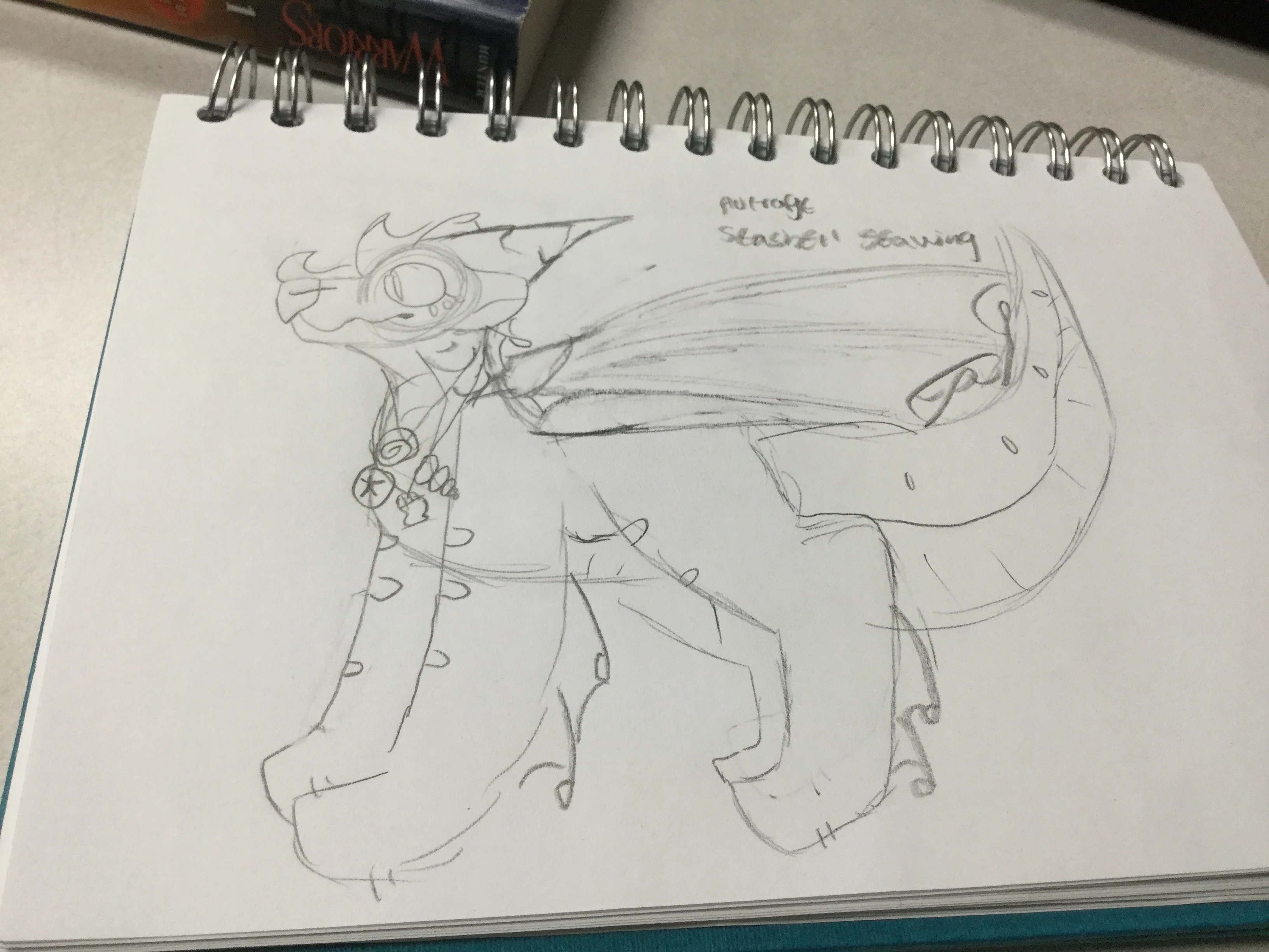 Appearance- As Seashell Seawings derived from normal seawings; they look very similar. They have larger wings because of rip currents. Their fin on their snout curves into a horn-like shape on the very tip. Their gills are quite rounded; and as stated before they have few to no luminescent scales. The webs, unlike normal seawings, begin higher on the head. They also have a few of the fins on their legs! Their tails are a bit bigger than a normal seawings for quickly maneuvering the sandy banks of their home.